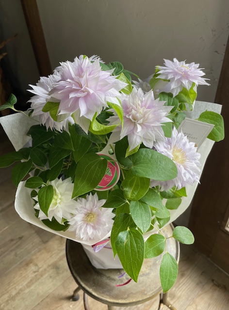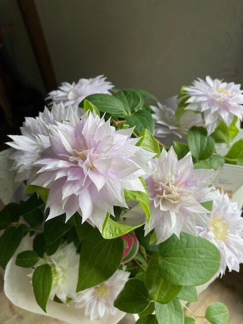 店頭では人気だったクレマチスの鉢。今年はwebにも登場。優しい色合いの八重咲のクレマチス。鉢植えとしても楽しめますが、お庭に植えてもOKです!