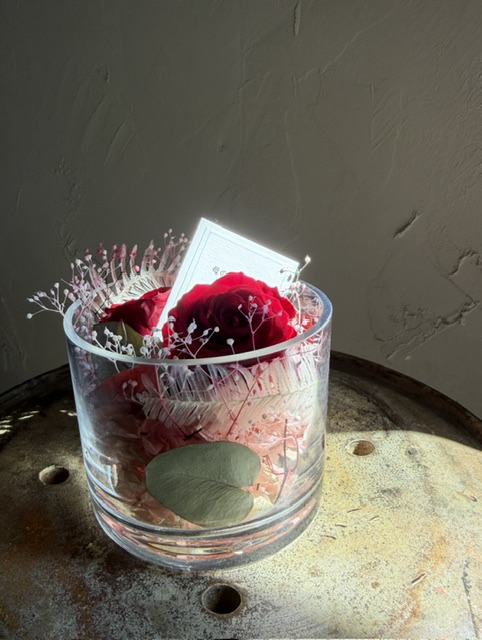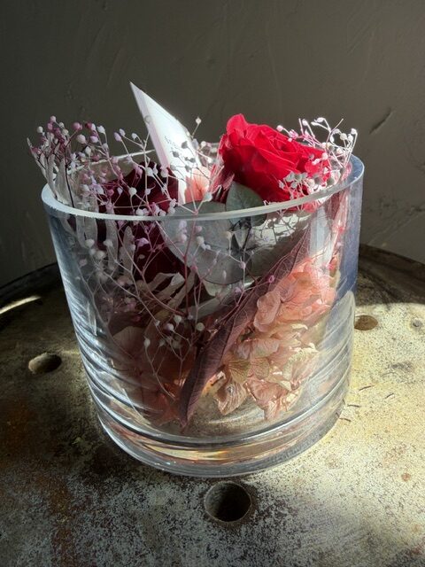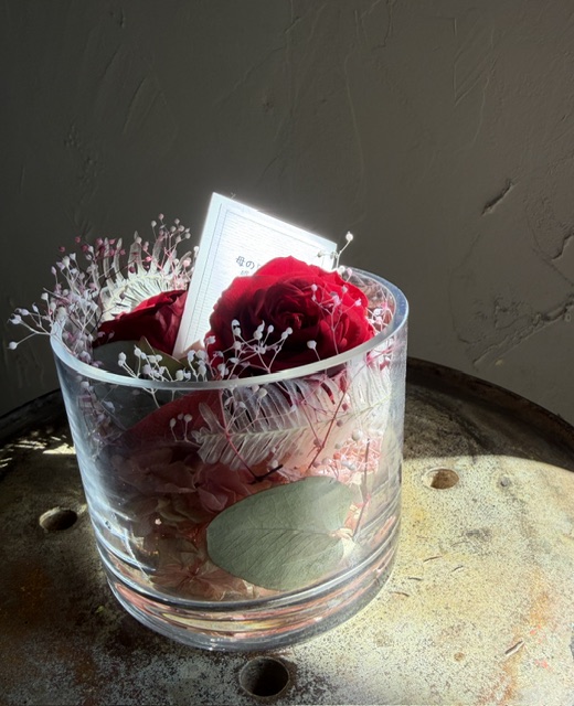 ガラスの花器にレッド系のプリザーブドフラワーを!光を通して綺麗です。忙しくて手間をかけられないお母様に!