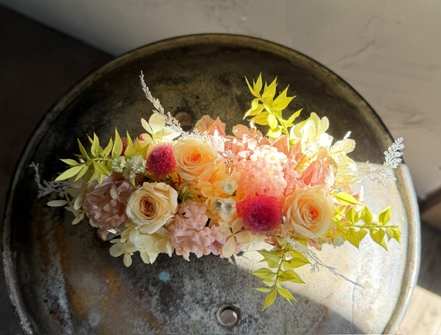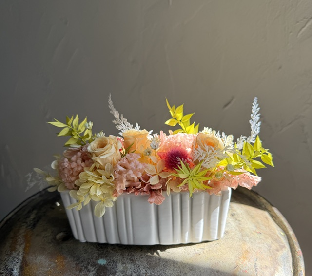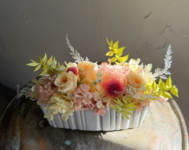 プリザーブドフラワーは手間が掛からず長く飾って頂けるので、お忙しいお母様へのプレゼントに人気です。高さを出さず横長に制作しました。ちょっとして棚や玄関など飾る場所は色々!