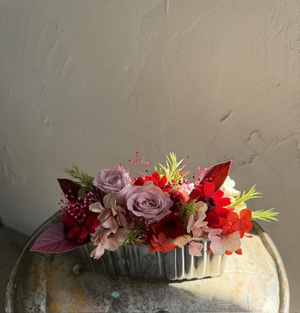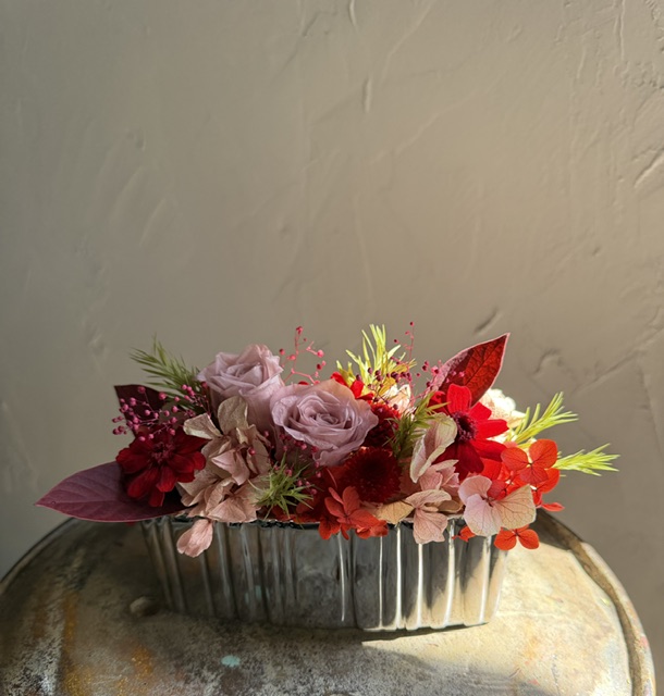 プリザーブドフラワーは手間が掛からず長く飾って頂けるので、お忙しいお母様へのプレゼントに人気です。高さを出さず横長に制作しました。ちょっとして棚や玄関など飾る場所は色々!